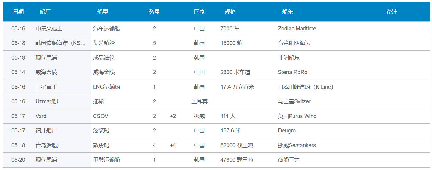 新船訂單匯總(2023.5.15-5.21) 來源:龍de船人 2023-05-22 9:23 據龍船訂單庫(http://www.6bar.net/order)統計,5月15日至5月21日報道的新船訂單有23+6艘。